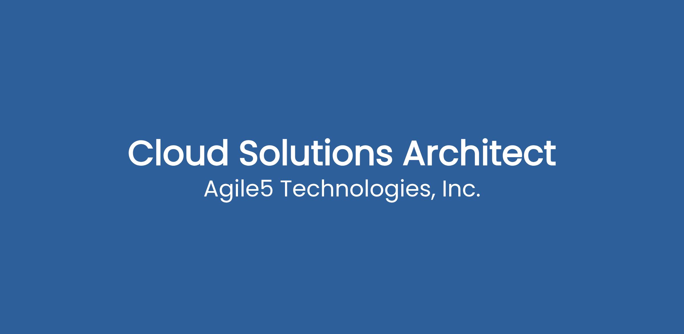 About Agile5: Agile5 Technologies, Inc., is a Woman-Owned Small Business (WOSB) and Information Technology (IT) services firm that specializes in the design, development, testing, integration, and maintenance of enterprise software systems. We believe our employees are the company’s most valuable asset. We are invested in seeing our employees grow in their careers, while maintaining a work/life balance. We are searching for a skilled, energetic, and focused Cloud Solutions Architect.